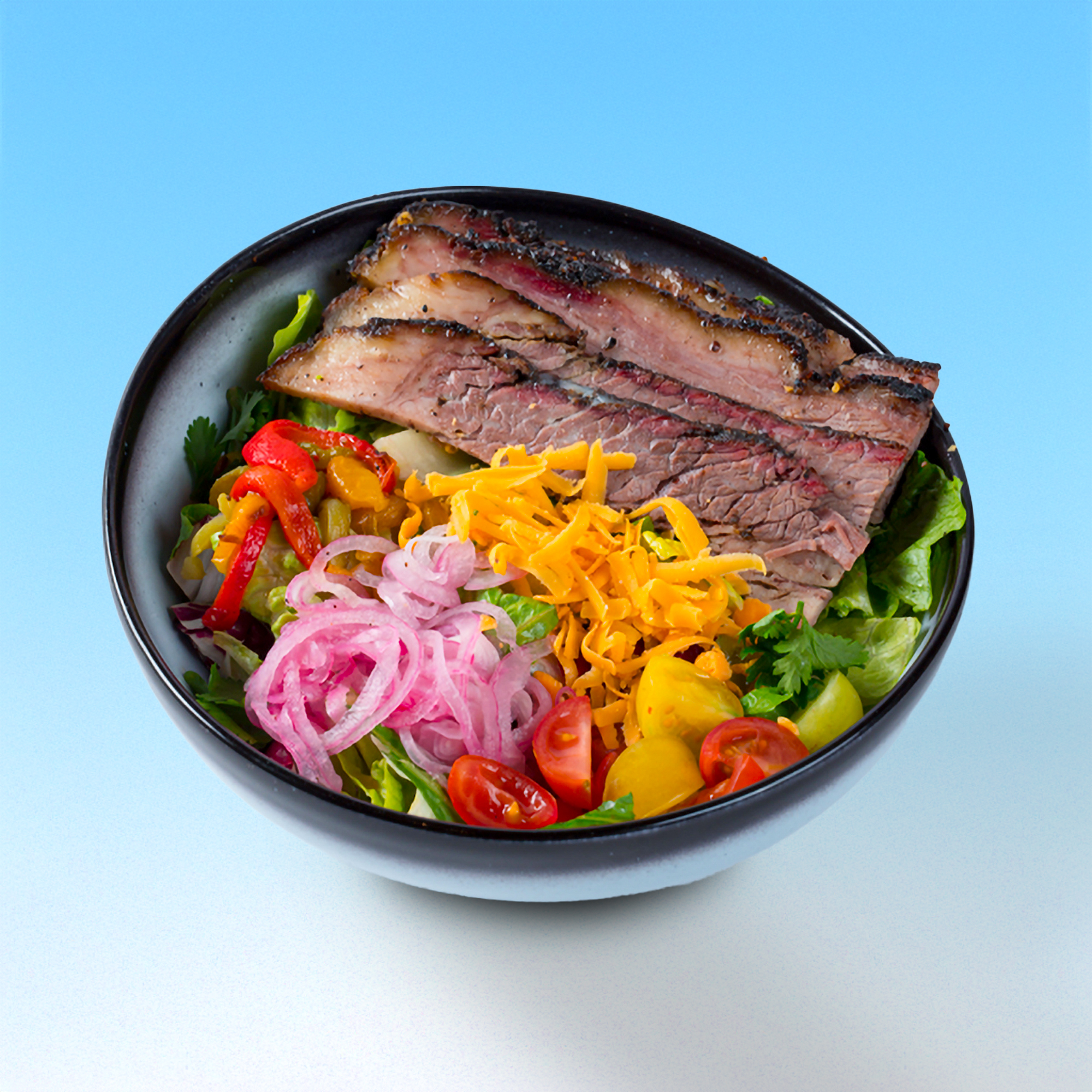 (850 Cal.) Sliced Smoked Brisket, Roasted Bell Peppers, Lettuce, American Cheddar Cheese, Cherry Tomatoes, Onion Pickle with Coriander Vinaigrette.